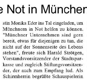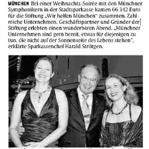 Bei einer musikalischen Weihnachts-Soirée mit den Münchner Symphonikern der Stadtsparkasse München kamen 66.342 Euro für die Stiftung „Wir helfen München“ zusammen. Die Stadtsparkasse hatte zu dem Benefizkonzert in ihre Hauptstelle im Tal eingeladen. Zahlreiche Unternehmen, Geschäftspartner sowie die Gründer der Stiftung, zu denen die Stadtsparkasse München, der Unternehmer Harry Habermann, heller & partner Marketing Services AG sowie die Sozietät Braun Leberfinger Ludwig gehören, unterstützten die Stiftung mit ihrer Spende. „Münchner Unternehmen sind gern bereit, etwas für diejenigen Münchner zu tun, die nicht auf der Sonnenseite des Lebens stehen“, erklärte Harald Strötgen, Vorstandsvorsitzender der Stadtsparkasse München und zugleich Vorsitzender der Stiftung „Wir helfen München“ erfreut. Schirmherr der Stiftung „Wir helfen München“ ist Oberbürgermeister Christian Ude.