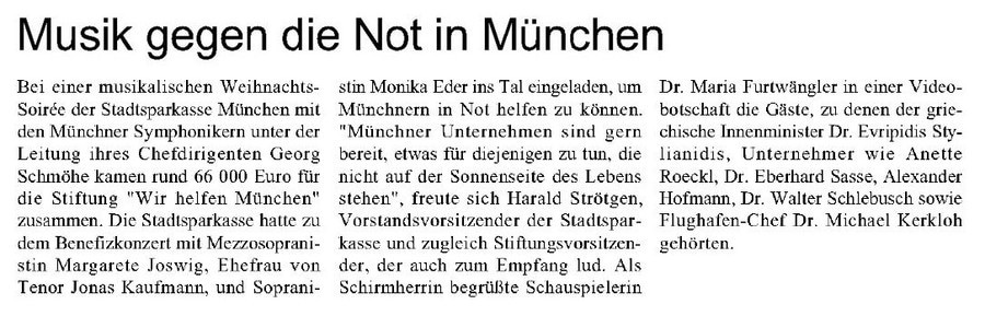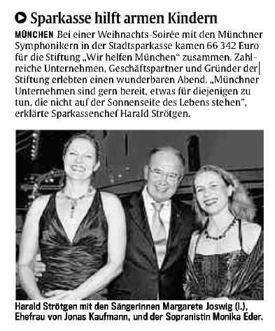 Bei einer musikalischen Weihnachts-Soirée mit den Münchner Symphonikern der Stadtsparkasse München kamen 66.342 Euro für die Stiftung „Wir helfen München“ zusammen. Die Stadtsparkasse hatte zu dem Benefizkonzert in ihre Hauptstelle im Tal eingeladen. Zahlreiche Unternehmen, Geschäftspartner sowie die Gründer der Stiftung, zu denen die Stadtsparkasse München, der Unternehmer Harry Habermann, heller & partner Marketing Services AG sowie die Sozietät Braun Leberfinger Ludwig gehören, unterstützten die Stiftung mit ihrer Spende. „Münchner Unternehmen sind gern bereit, etwas für diejenigen Münchner zu tun, die nicht auf der Sonnenseite des Lebens stehen“, erklärte Harald Strötgen, Vorstandsvorsitzender der Stadtsparkasse München und zugleich Vorsitzender der Stiftung „Wir helfen München“ erfreut. Schirmherr der Stiftung „Wir helfen München“ ist Oberbürgermeister Christian Ude.
