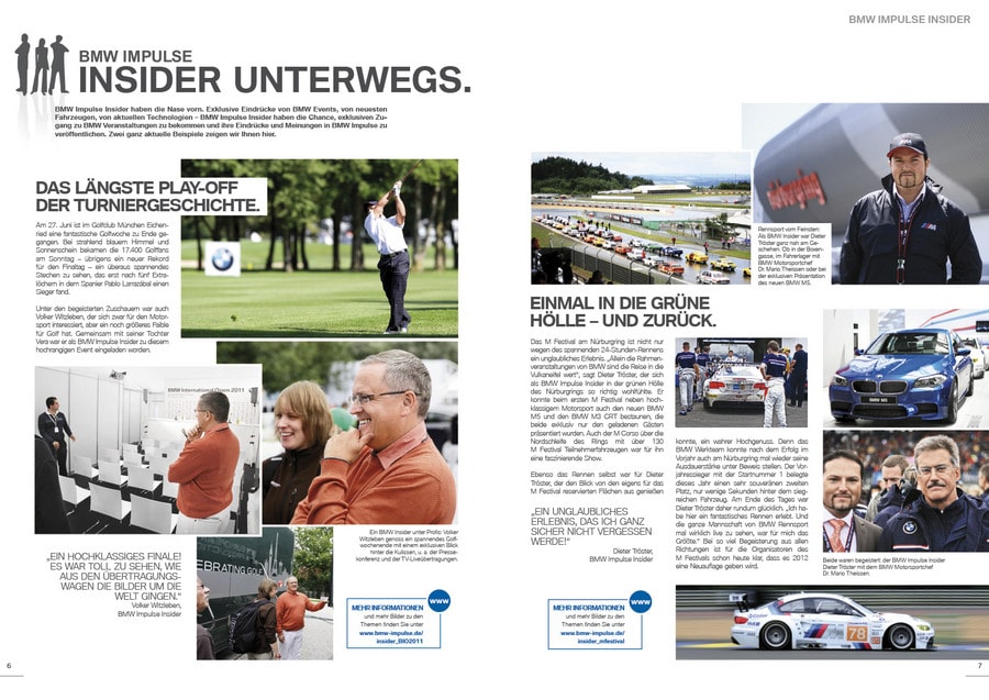 Und das ist noch nicht alles. Im ganzen Heft finden sich Beispiele für diese „Alltags-Testimonials“, die unvoreingenommen über ihre Erlebnisse mit der Marke BMW sprechen – und damit auch für sie werben. Da erzählen ehemalige Besitzer von Fremdfahrzeugen, warum Sie jetzt zu BMW gewechselt sind – bei einem Fahrertraining am Airport München. Und dank BMW Impulse konnte ein Leser nicht nur die Atmosphäre beim 24-Stunden-Rennen am Nürburgring genießen, sondern auch hinter die Kulissen schauen – die von BMW natürlich.
