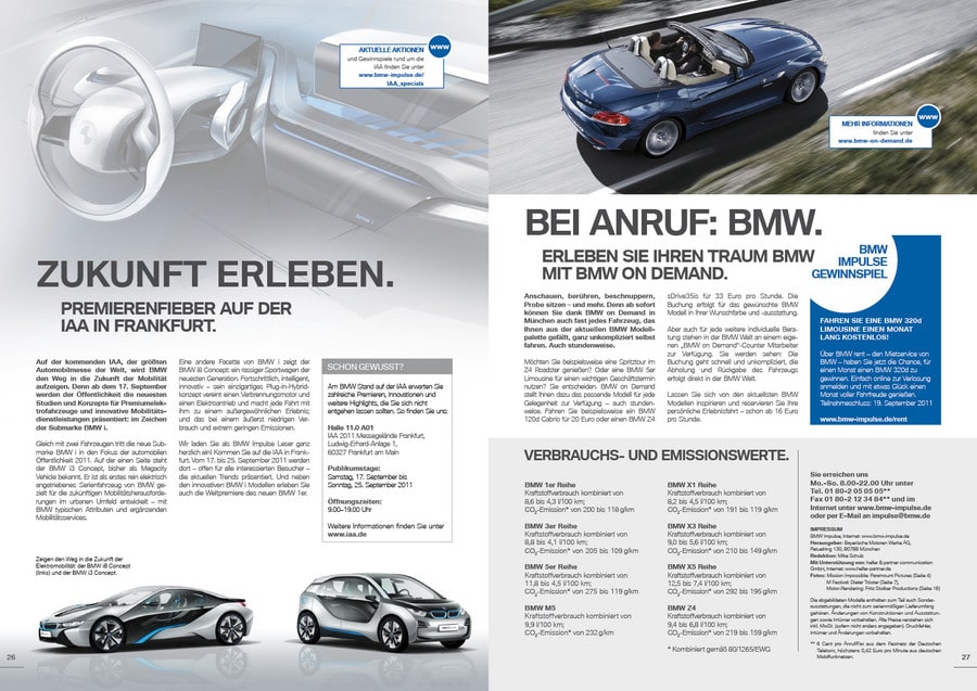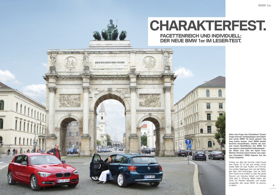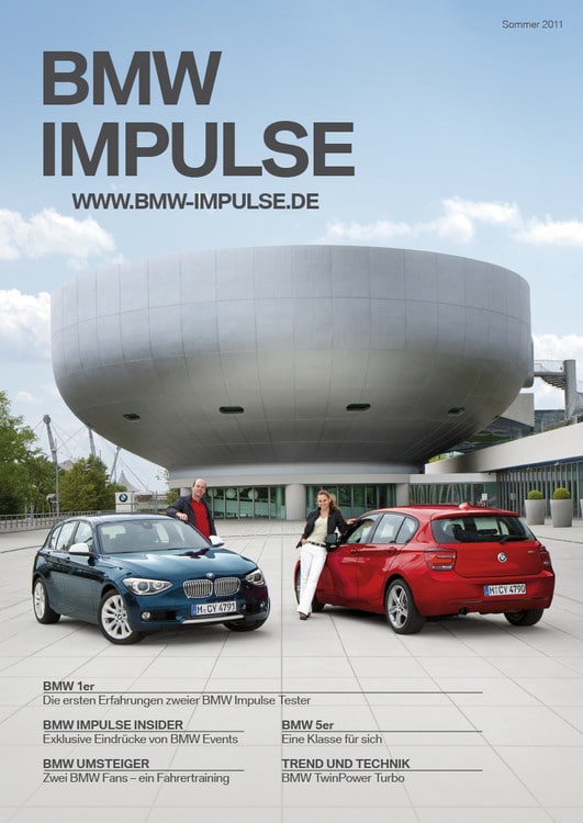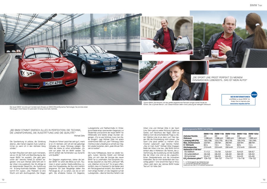 Beispiel BMW 1er: Das neue Modell ist eine der wichtigsten Markteinführungen des Jahres, die Medien berichten eifrig. Der Vorteil von „BMW Impulse“: Hier gibt es keinen Tech-Talk und auch keine Werbebotschaften; hier erzählen zwei Bewerber des „BMW-Insider“-Programms, was Sie mit dem neuen Fahrzeug erlebt haben. Auf Einladung des Magazins sind sie in München, begleitet von einem Fotografen, bei der Fahrt durch die Stadt. So ist nicht nur die Kulisse authentisch, auch die Aussagen sind es.