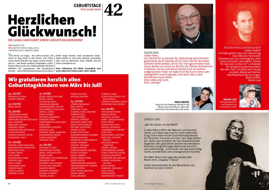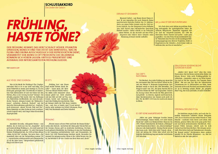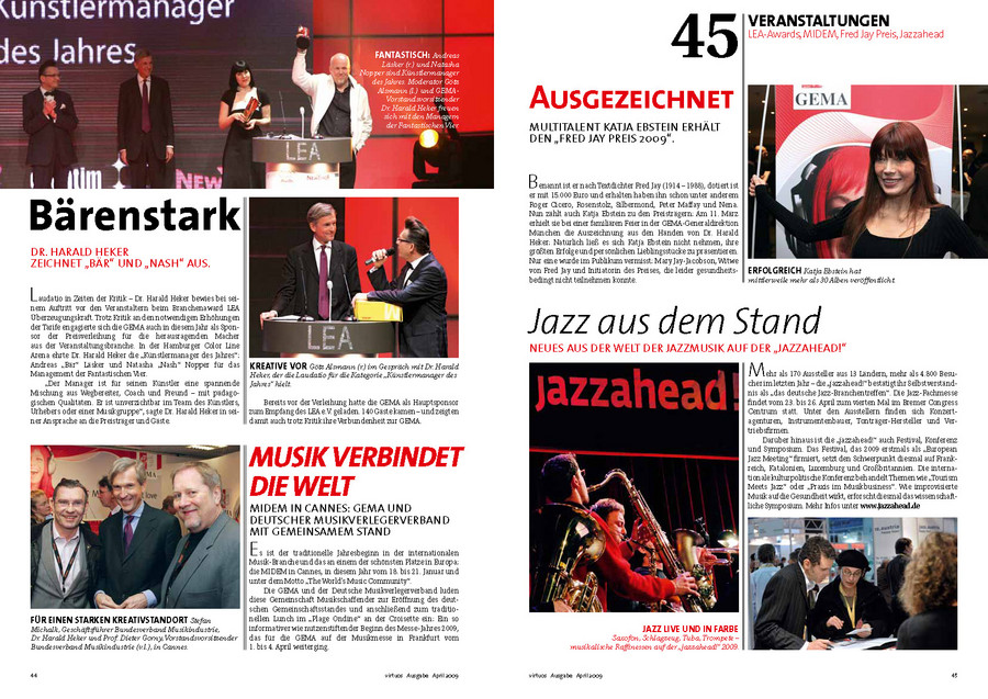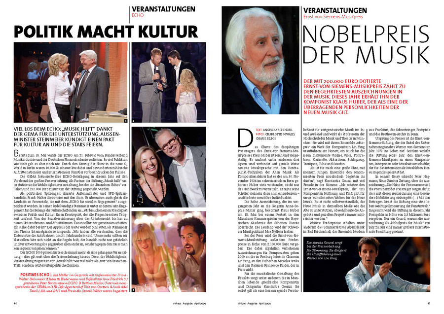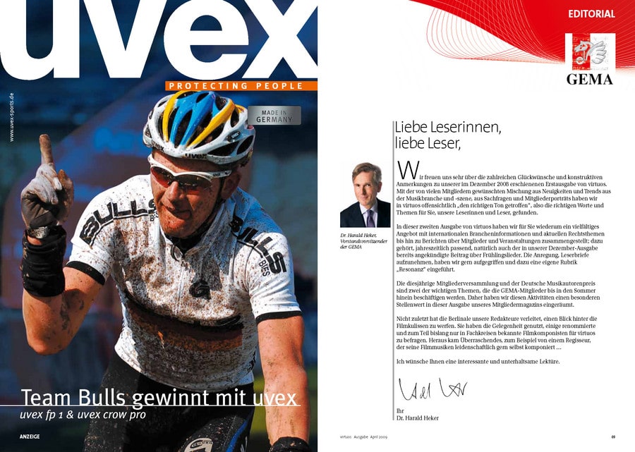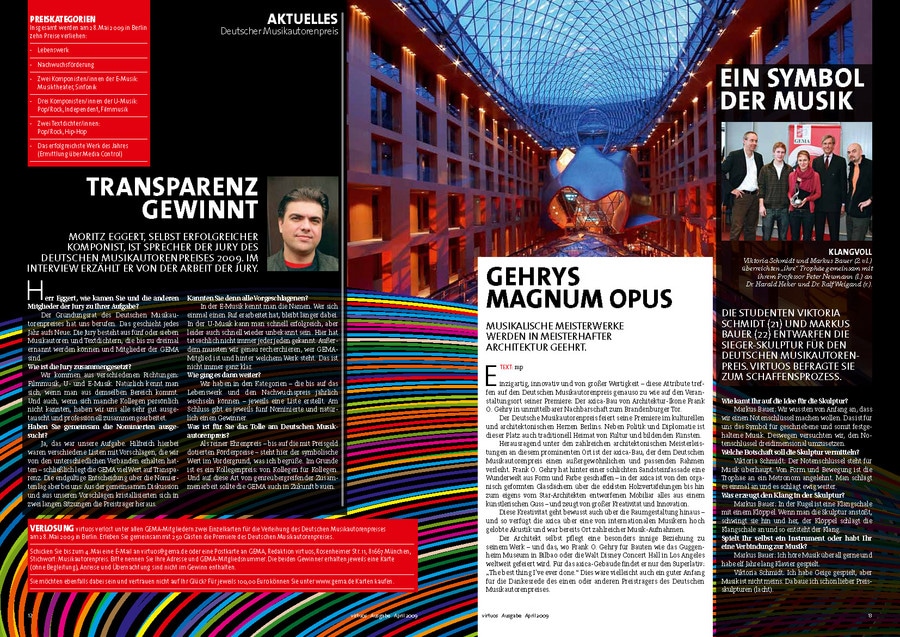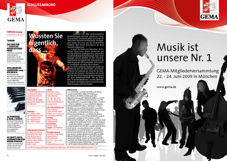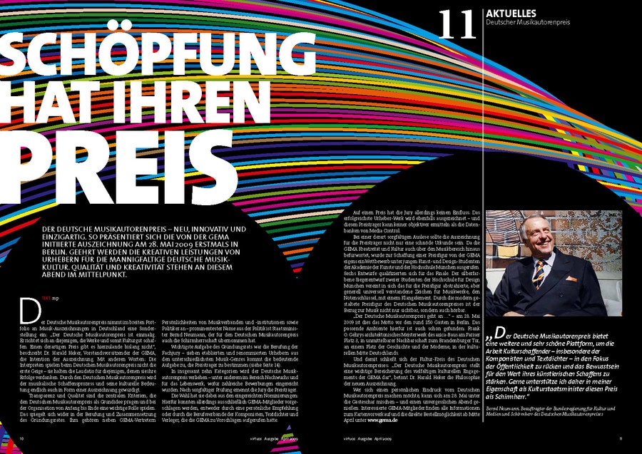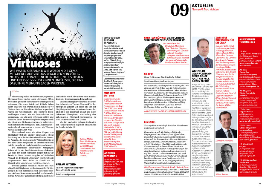 „Das Magazin virtuos ist einfach spitze. Herzlichen Glückwunsch.“ – „Wir sagen: Gratulation zu diesem wunderbaren Magazin.“ Die Leserreaktionen auf die erste Ausgabe von virtuos, dem neuen Magazin der GEMA, waren überwältigend. Die Messlatte für die zweite Ausgabe von virtuos lag also hoch: Die etwa 60.000 Mitglieder der Verwertungsgesellschaft für musikalische Aufführungs- und mechanische Vervielfältigungsrechte erwarten fachlich anspruchsvolle Texte und ein ansprechendes Layout. Gemeinsam mit der GEMA hat heller & partner erneut spannende Themen entwickelt und Leserwünsche umgesetzt, zum Beispiel die Rubrik „Resonanz“ eingeführt, in der Leserbriefe veröffentlicht werden. Von der Berlinale inspiriert, widmet sich die Titelgeschichte dem Thema Filmmusik: Regisseur Tom Tykwer erzählt von seiner Arbeit als Komponist, außerdem kommen Größen wie Klaus Doldinger, Hans Zimmer und Annette Focks zu Wort.