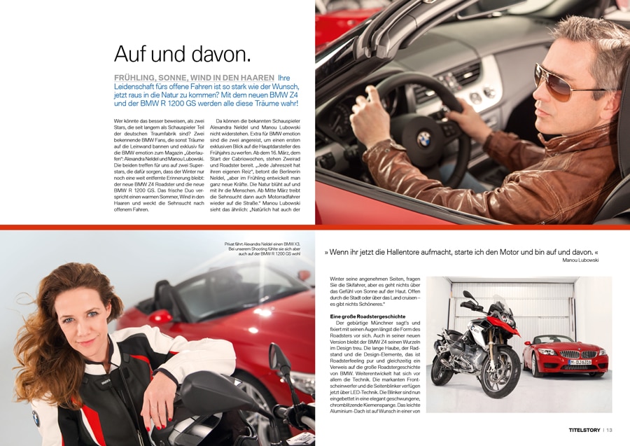 Was passt besser zum Frühling als Wind in den Haaren, Sonne auf der Haut und zwei echte offene Superstars auf dem Titel? Um die warme Jahreszeit gebührend zu begrüßen, gibt es in der ersten BMW emotion des Jahres 2013 eine ganze besondere Premiere zu feiern: Zum ersten Mal in der 15-jährigen Geschichte des Magazins stehen ein verführerischer Roadster und eine beeindruckende Reiseenduro gemeinsam im Fokus.