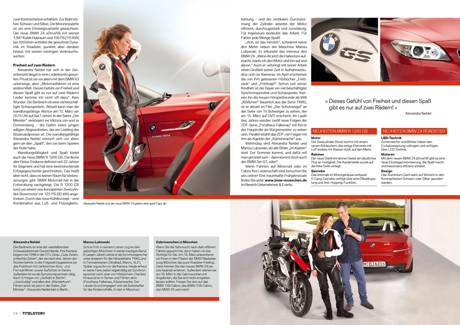 Der Sehnsucht nach offenem Fahren konnten auch die bekannten Schauspieler Alexandra Neldel und Manou Lubowski nicht widerstehen. Extra für BMW emotion sind die beiden Stars angereist, um bei unserem Fotoshooting einen exklusiven Blick auf die motorisierten Hauptdarsteller des Frühjahrs zu werfen und sie ausführlich vorzustellen. Bereut haben sie ihre Entscheidung dabei zu keiner Sekunde. „Wenn ihr jetzt die Hallentore aufmacht, starte ich den Motor und bin auf und davon“, betonte etwa der vielbeschäftigte Synchronsprecher und Schauspieler Manou Lubowski.