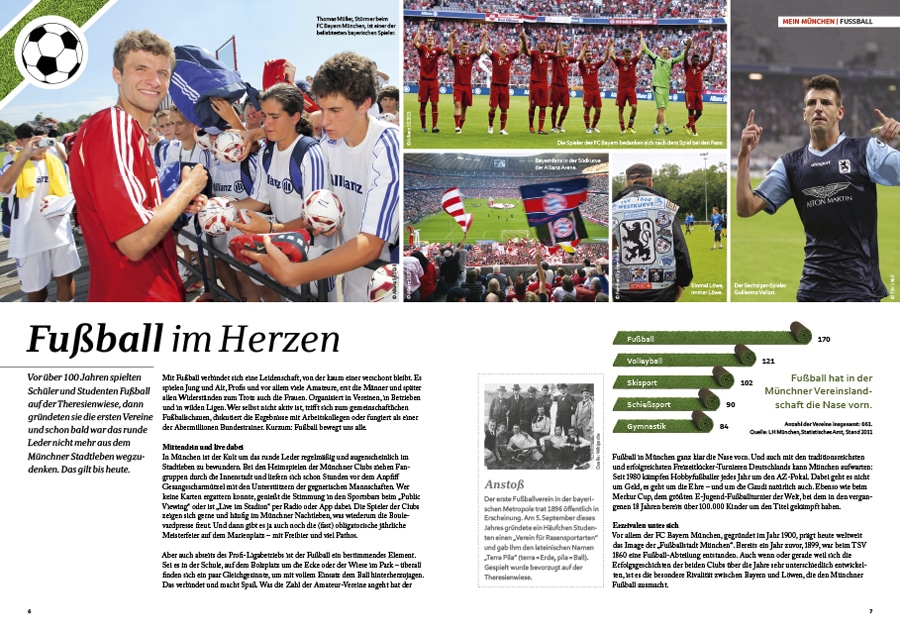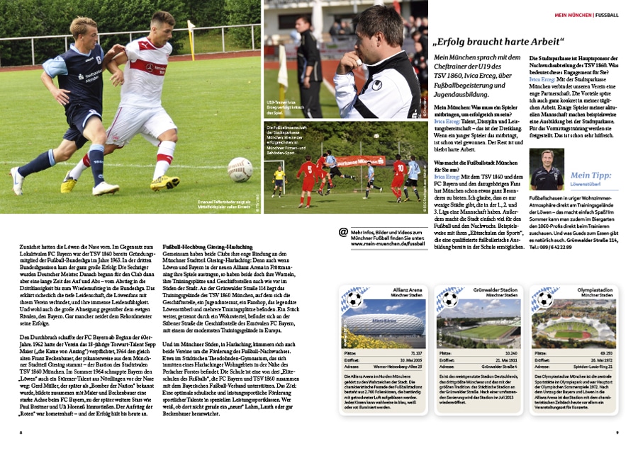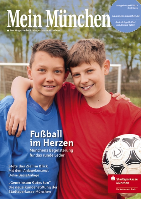 „Mein München“, das Magazin der Stadtsparkasse München, startet in den Frühling und widmet sich dabei intensiv dem Stadtteil Harlaching, einer Fußballhochburg Münchens. Im Fokus der aktuellen Ausgabe steht die Begeisterung der Landeshauptstadt für das runde Leder, die vor allem durch die traditionelle Rivalität zwischen Bayern und den Löwen geprägt ist. Auf der Titelseite des Heftes sind deshalb Philipp und Josip zu sehen, zwei begeisterte Fußballspieler des Harlachinger Theodolinden-Gymnasiums.