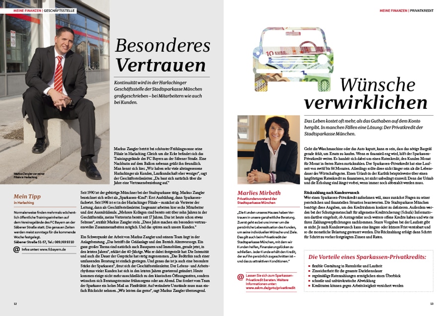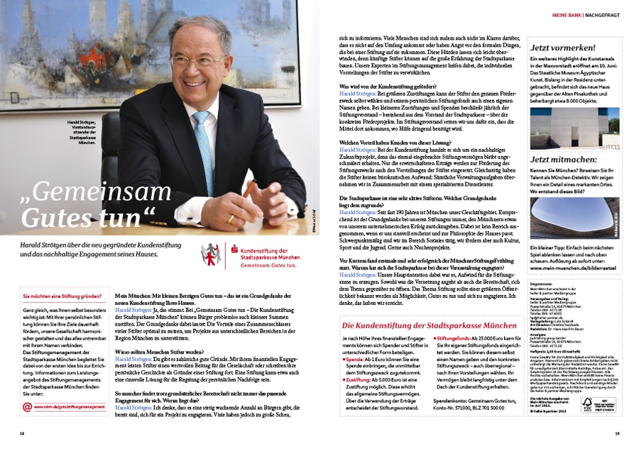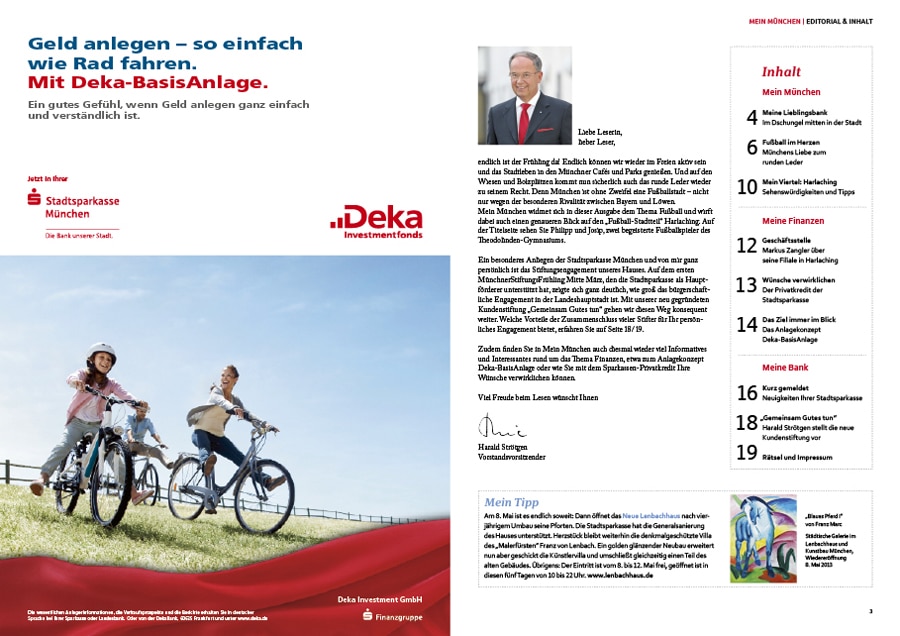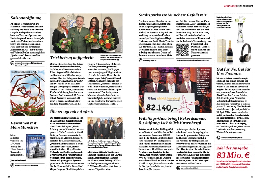 Das Magazin „Mein München“ hat sich einen festen Platz in der Münchner Medienlandschaft gesichert. Gerade junge Leser schätzen die unterhaltsame Aufmachung und das abwechslungsreiche redaktionelle Konzept, das interessante München-spezifische Themen mit aktuellen News und Hintergrundberichten aus der Finanz- und Sparkassenwelt ergänzt. Für den Leser bedeutet das echten Mehrwert. Noch dazu, da das Magazin durch die Verbindung von Internetpräsenz, iPad-Lösung, Video und Print crossmedial vernetzt ist. Ein integriertes Konzept, das die Leser und Kunden der Stadtsparkasse unterhält, informiert und bindet.
