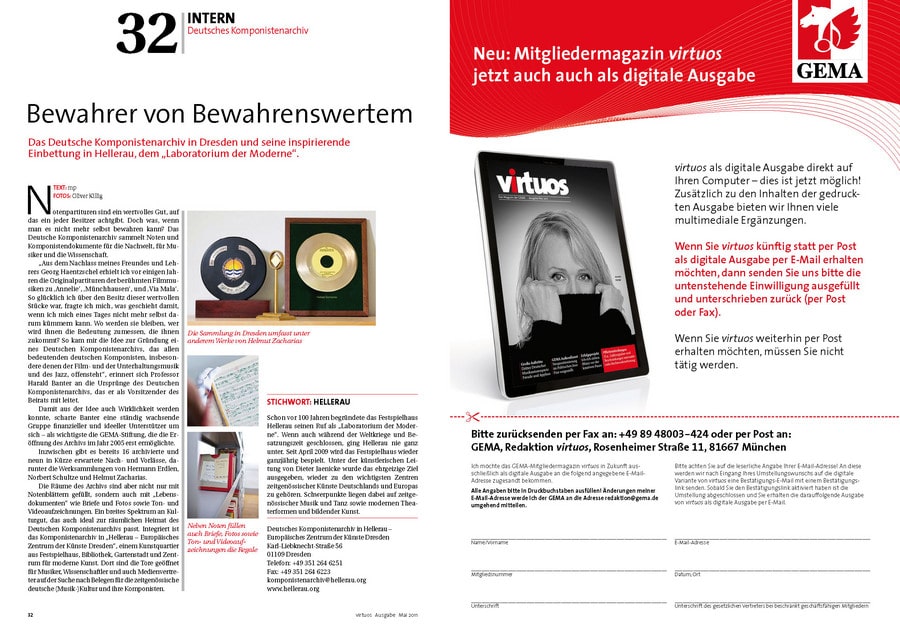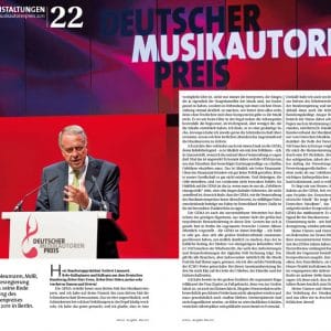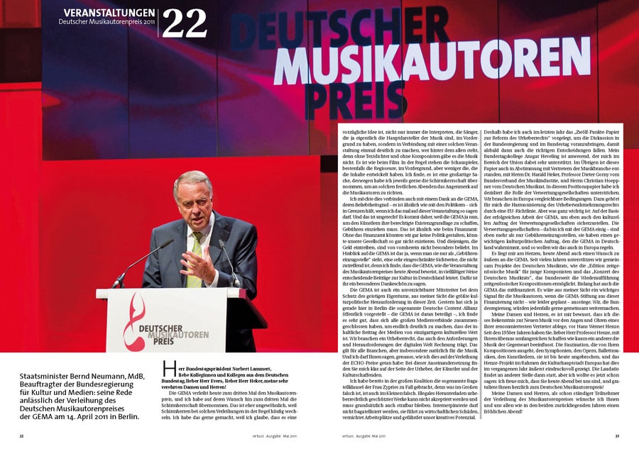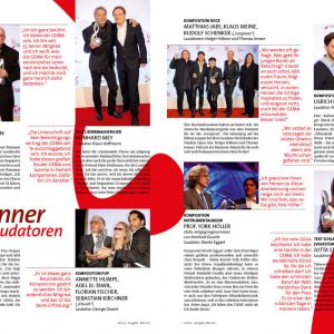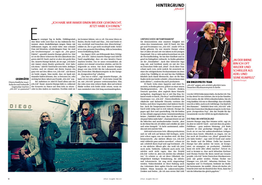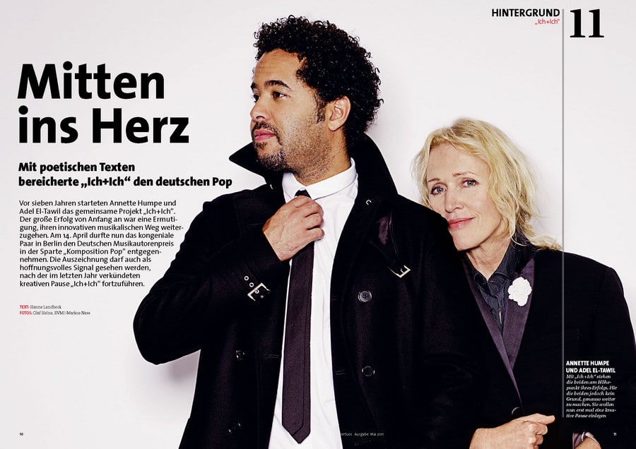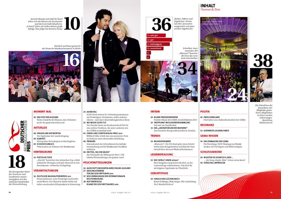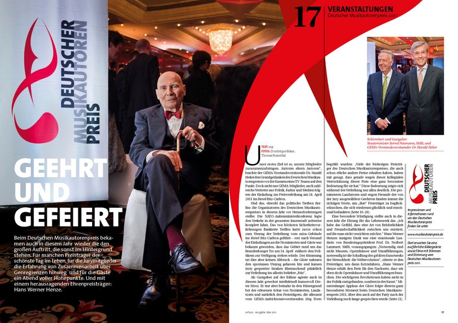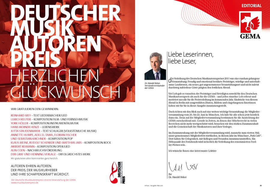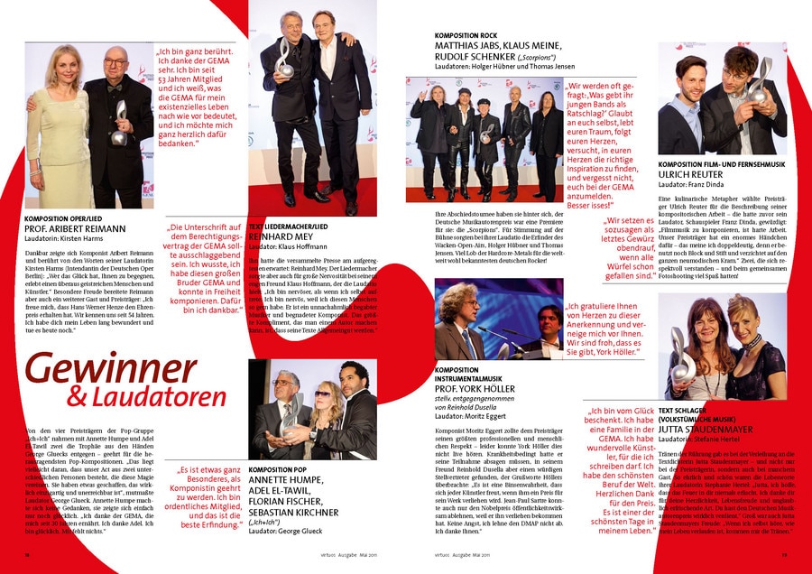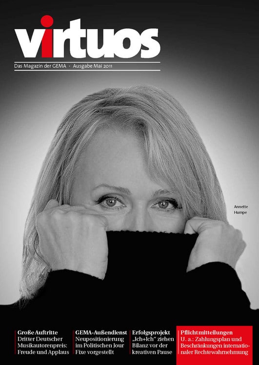 Für manchen Preisträger der schönste Tag des Lebens, für die Jurymitglieder die Erfahrung der Zusammenarbeit über Genregrenzen hinweg und für die Gäste ein unvergesslicher Abend voller Höhepunkte: Bei dem von der GEMA nun bereits zum dritten Mal verliehenen Deutschen Musikautorenpreis wurden auch 2011 wieder Musiker für ihr „ausgezeichnetes“ Wirken geehrt. Die aktuelle Ausgabe der GEMA-Mitgliederzeitschrift virtuoswidmet diesem Highlight ihre Titelgeschichte. Annette Humpe, die zusammen mit Ihrem Partner Abdel El-Tawil vom Duo „Ich+Ich“ die Auszeichnung in der Kategorie „Komposition Pop“ gewann, ziert das Cover. Zu Recht: Denn das Duo bereichert mit poetischen Texten den deutsche Pop und trifft immer wieder „Mitten ins Herz“.