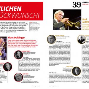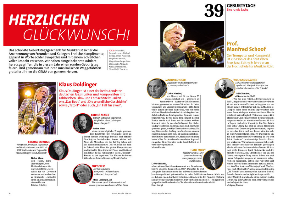 Eine ganz besondere Rubrik ist „Eine runde Sache“. Hier gratuliert die GEMA in jedem Heft Mitgliedern, die einen runden Geburtstag feiern. Und das nicht nur persönlich! Vielmehr kommen Freunde und Weggefährten zu Wort. Und davon hat Udo Lindenberg mit seinen nun 65 Jahren viele. In der aktuellen virtuos gratulieren ihm Mitglieder des Panikorchesters, Komponisten und auch Serkan Kaya, der im Musical „Hinterm Horizont“ den Udo Lindenberg gibt. Da schließen wir uns gern an: Glückwunsch, Udo!