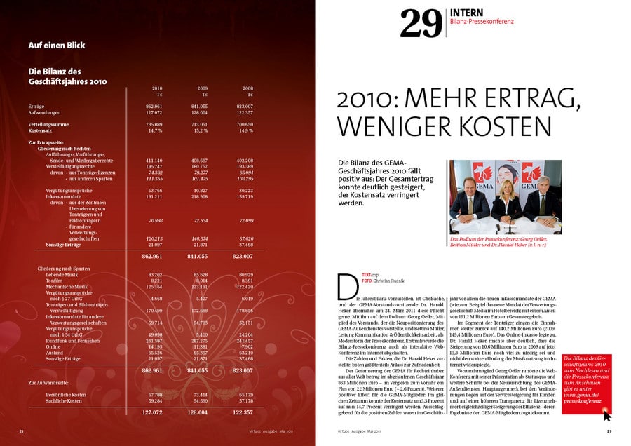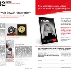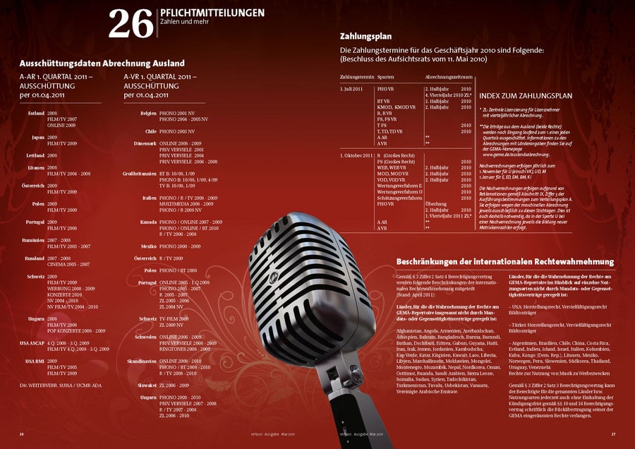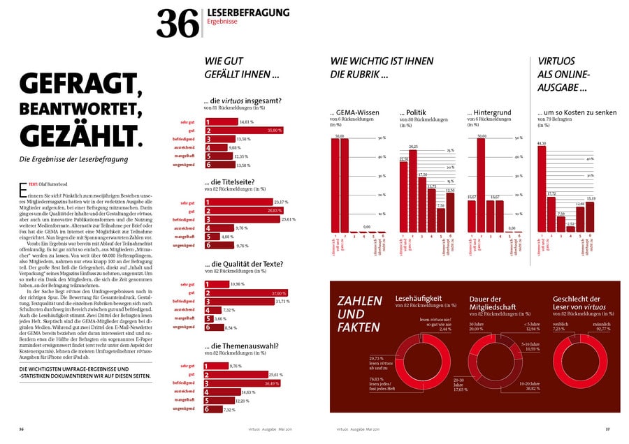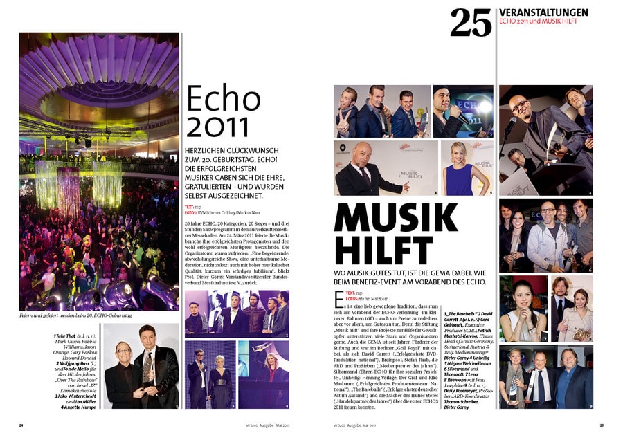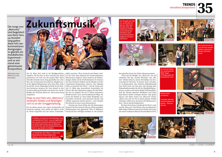 Längst hat sich virtuos als „Branchenorgan“ etabliert. Die Mitgliederzeitschrift informiert die mehr als 60.000 GEMA-Mitglieder sachlich und fachlich, aber gleichwohl unterhaltsam aufbereitet über Neuigkeiten aus der Musikbranche. Das Magazin erscheint vierteljährlich und wird weltweit versendet. Und es kommt bei den Lesern gut an! Das belegen die Ergebnisse einer Leserbefragung, die im aktuellen Heft zu finden sind. Daneben gibt es auch in dieser Ausgabe wieder viel Wissenswertes und Interessantes zu erfahren – etwa rund um Veranstaltungen wie den Echo 2011, politische Entwicklungen, die den Musikmarkt betreffen, oder Trendthemen wie „Interaktives Komponieren“. Eine Entwicklung, die die Musikbranche revolutionieren könnte. Per 24-Stunden-Livestream konnten Fans virtuell in den Londoner Metropolis Studios mit dabei sein, als die Musiker der US-Band „Maroon5“ einen neuen Song einspielten.