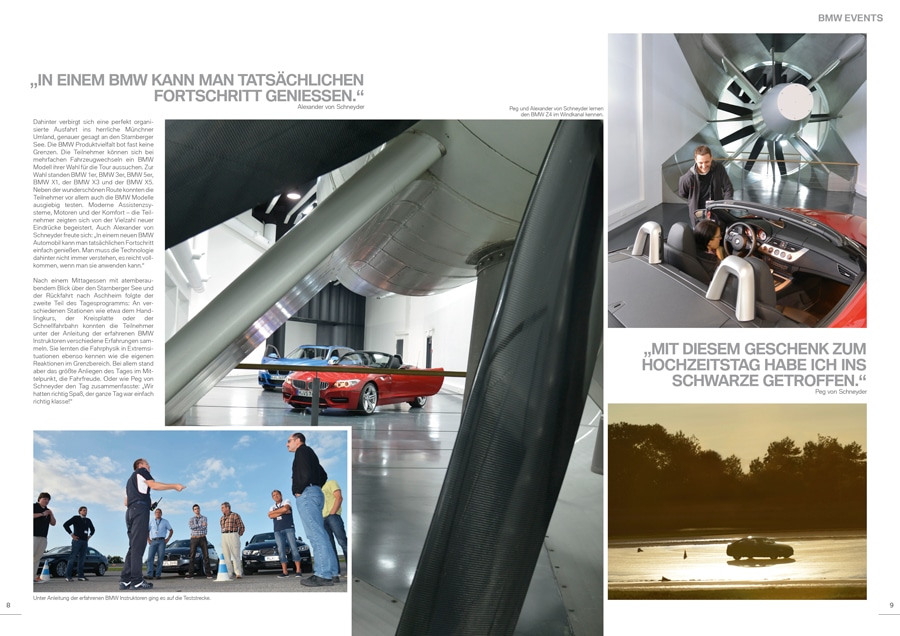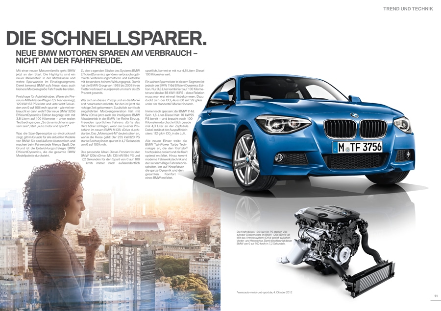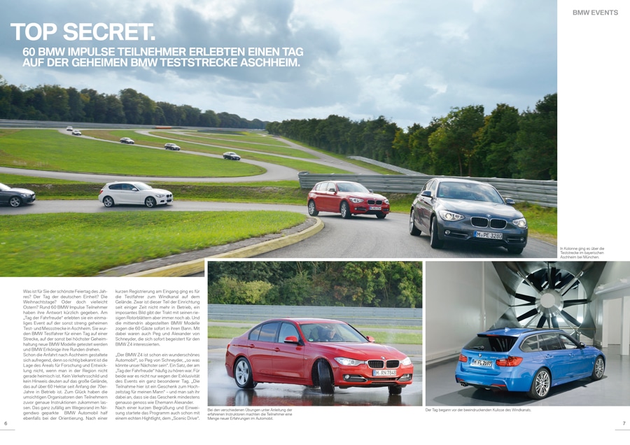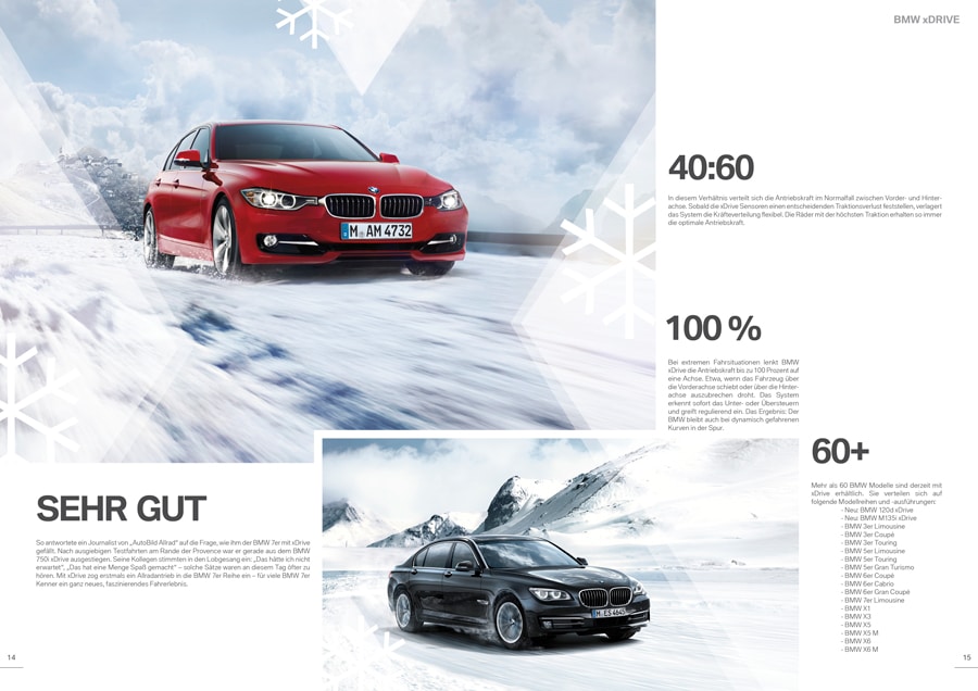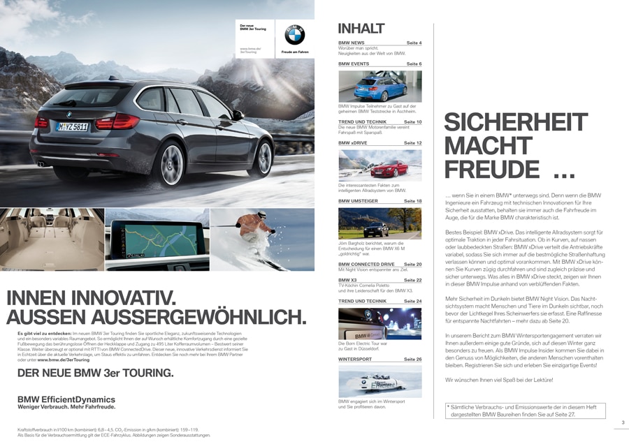 Spannende Geschichten und ein attraktives Layout sind die Grundlage für viel Lesespaß. Die Beiträge reichen weit über die bekannte Produktkommunikation hinaus und verlinken durch ihre authentische Wirkung die Leser eng mit der Markenwelt von BMW. Im Mittelpunkt der aktuellen Ausgabe steht das Thema Elektromobilität mit dem BMW i3 und BMW i8 concept. Auch die große BMW Flotte von Automobilen mit dem Allradantrieb BMW xDrive ist spannend.